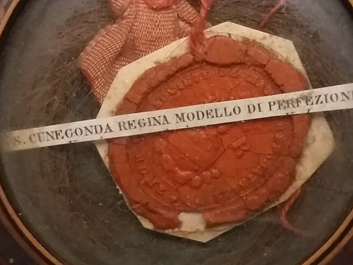 In 1025, exactly one year after the death of her husband, St. Cunigunde retired to Kaufungen Abbey, in Hesse, Germany, where she entered the monastery of Benedictine nuns she had founded there. At the dedication of the monastery, she offered a relic of the True Cross, removed her regalia, and donned the habit of the nun. There she remained at the monastery, performing charitable works, caring for the sick and devoting her time to prayer.